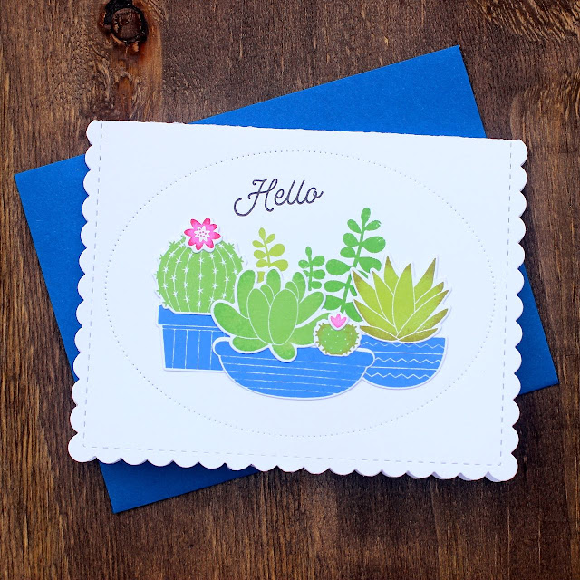 This next one is the same idea, but with just a single pot and the sentiment is from Sentiment Staples: Just a Note. I also mixed in a different set. See that little spiky plant on the right? That one is from Papertrey Ink's Putting Down Roots set, but it fit in beautifully.